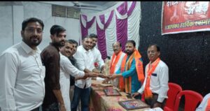 शोभायात्रा में महिलाओ ने मेहरून रंग की साड़ी तो पुरुषों ने सफेद कुर्ता पायजामा पहनकर गले मे भगवा दुपट्टा डाले सम्मिलित हुए।