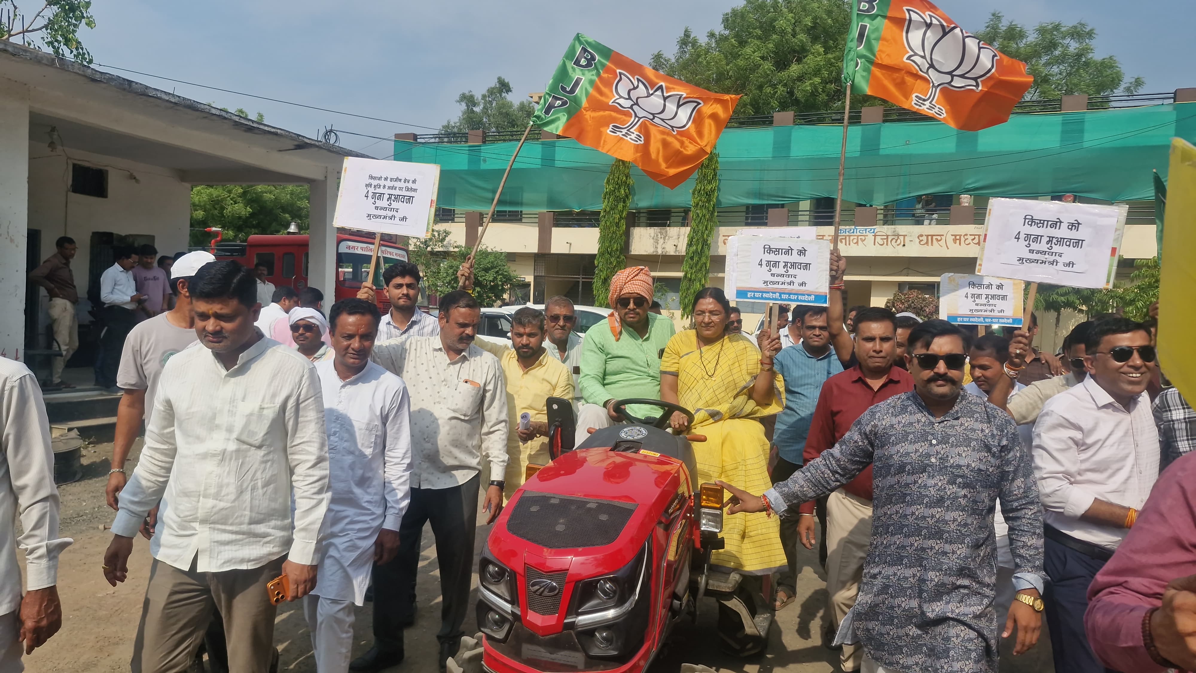 मनावर :- भारतीय जनता पार्टी किसान मोर्चा द्वारा मध्य प्रदेश कैबिनेट के महत्वपूर्ण निर्णय जिसमे किसानों को ग्रामीण क्षेत्र में कृषि भूमि के अर्जन पर बाजार दर का 4 गुना मुआवजा देने की घोषणा पर भाजपा धार ग्रामीण जिले के मनावर नगर में किसान मोर्चा द्वारा आभार प्रदर्शन रैली निकाली गई। रैली मनावर नगर पालिका से गांधी चौराहे तक निकल गई। आभार प्रदर्शन रेली में केंद्रीय मंत्री श्रीमती सावित्री ठाकुर ट्रैक्टर चलाकर आभार प्रदर्शन करने पहुंची। इस दौरान उन्होंने कहा कि माननीय मुख्यमंत्री डॉ मोहन यादव जी की अध्यक्षता में आयोजित कैबिनेट बैठक में डबल इंजन की सरकार ने ग्रामीण क्षेत्र की कृषि भूमि के अर्जन पर बाज़ार दर का 2 की जगह 4 गुना मुआवजा देने का महत्त्वपूर्ण निर्णय लिया है।