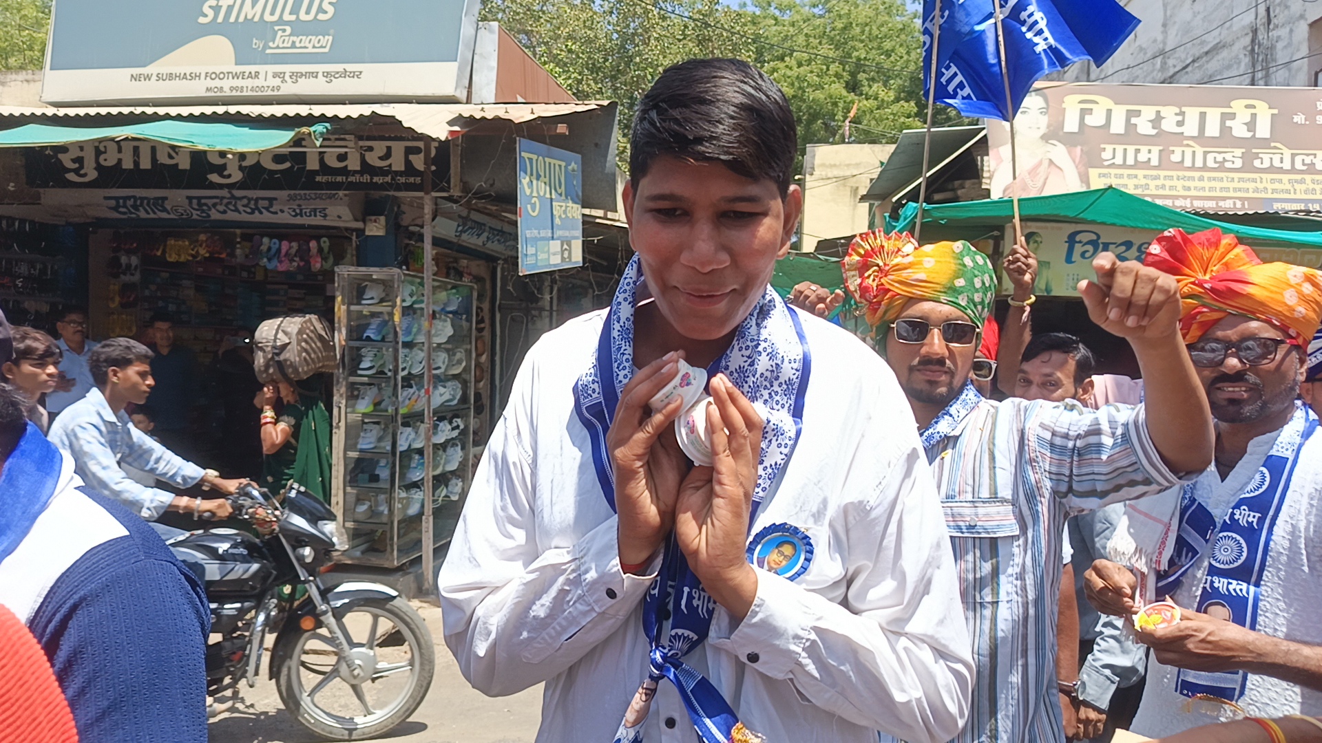 दो-दो की पंक्ति में चल रहे भीम दीवाने देशभक्ति और सामाजिक एकता के गीतों पर नाचते-झूमते नजर आए। नगर के विभिन्न स्थानों पर रैली का पुष्प वर्षा कर भव्य स्वागत किया गया।